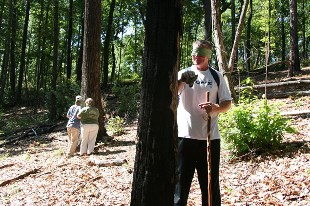 During a hands-on activity in a forest outside Moundville, students explore trees while blindfolded. Bert Patterson, foreground, notices that his tree and its bark feel, smell and sound unusual, then discovers that it was struck by lightning. “To me, that experience was about slowing down and tuning in,” says Patterson, an operations manager for FedEx in Gadsden, Ala. “Don’t be in such a hurry.”